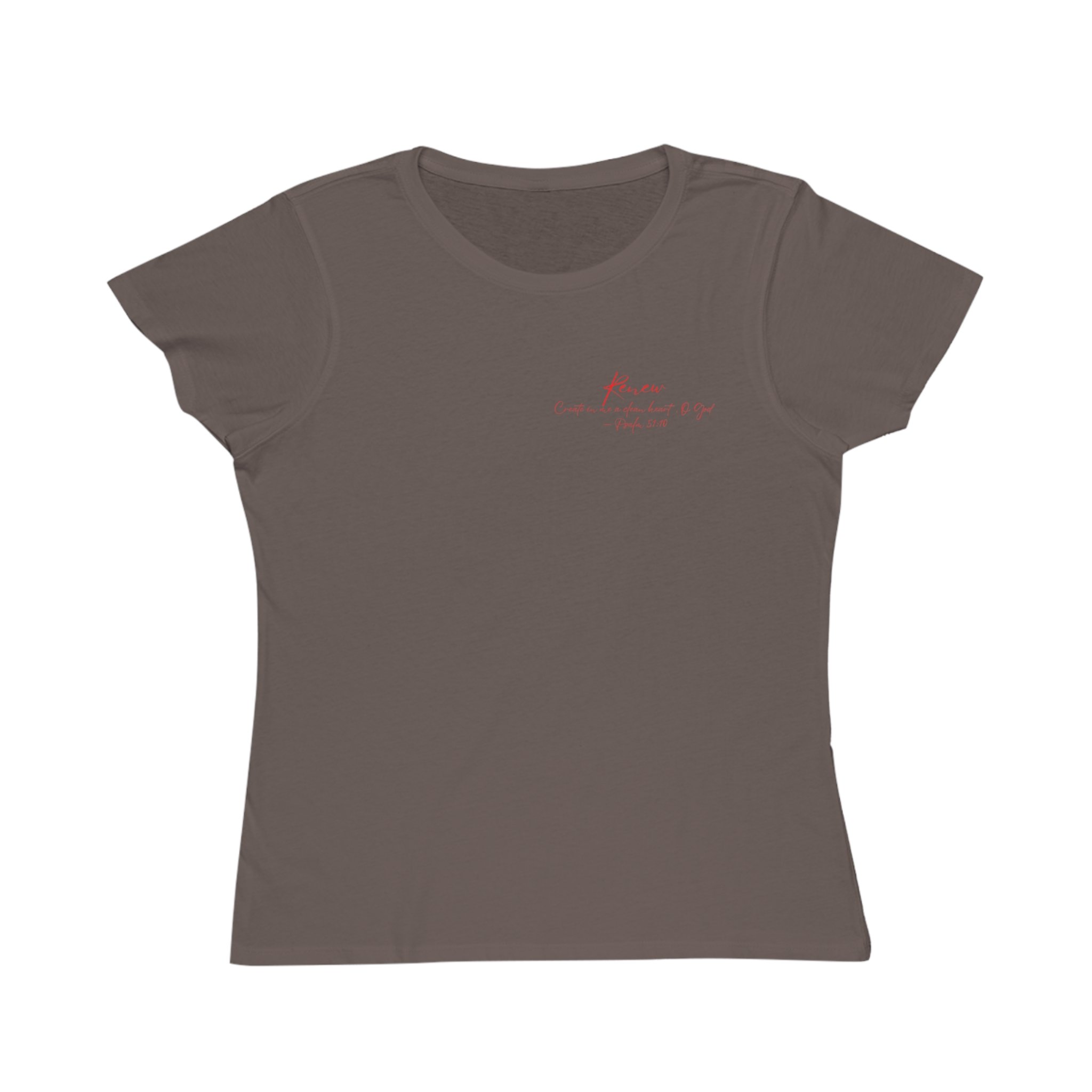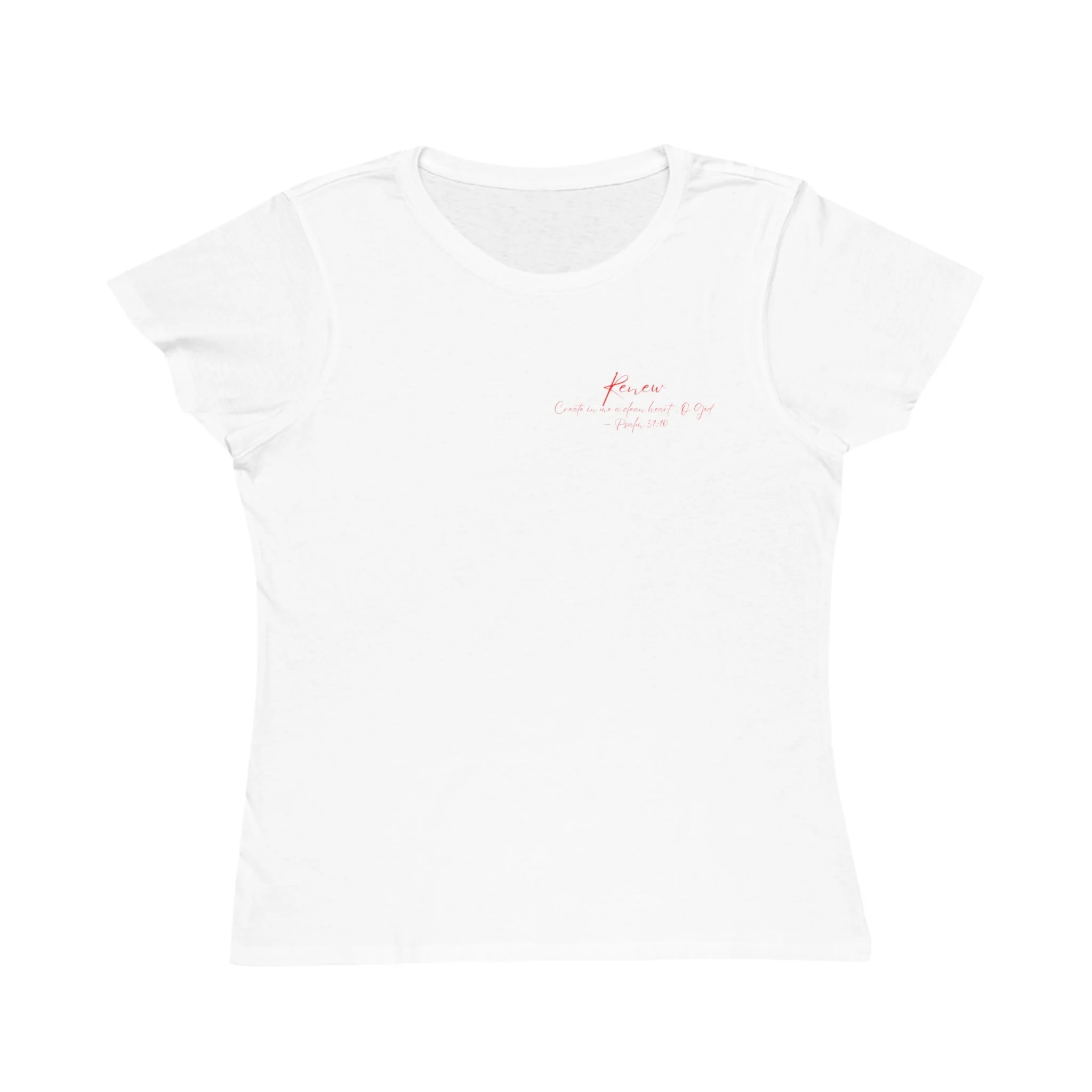 Light, soft, and quietly hopeful — this women's tee carries a whisper of renewal. A gentle blush square frames the handwritten word “Renew,” with a small script verse beneath: “He restores my soul — Psalms 23:3.” The semi-slim silhouette and featherweight organic cotton sit close to the body, layering easily under cardigans or worn alone for a quiet, intentional statement. Breathable and warm, the fabric moves with you while the ribbed collar and self-fabric shoulder tape keep lines smooth and comfortable. This shirt reads like a personal reminder: calm, restorative, and unassuming.